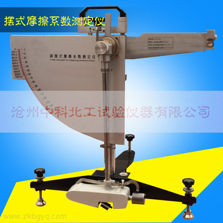 5、擺頭:由上下部接頭、擺桿、彈簧、杠桿、舉升柄、捶殼、滑溜塊及橡膠片(76mm*25.4mm*6.35mm)組成,它對擺動(dòng)中心有規(guī)定力矩,對路面有規(guī)定壓力。擺頭前與后、左與右的力矩保持平衡,它是度量路面摩擦系數(shù)的尺度。擺式摩擦系數(shù)測定儀的結(jié)構(gòu)照片如圖1所示。