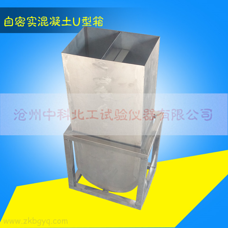 1、U型箱采用材料應為優(yōu)質(zhì)不銹鋼,內(nèi)表面應平滑,并就盡量減少混凝土與容器的摩擦阻力。組裝后的填充裝置應堅固,且能觀察混凝土的流動狀態(tài)。在填充裝置的中央部位放置格柵型障礙,1型格柵由5根φ10mm光圓鋼筋制成。2型格柵由3根φ13mm光圓鋼筋制成?筛鶕(jù)結(jié)構(gòu)物的形狀、尺寸及配筋狀況等,中科北工結(jié)合自密實混凝土等級選擇相應的障礙和檢測標準。
