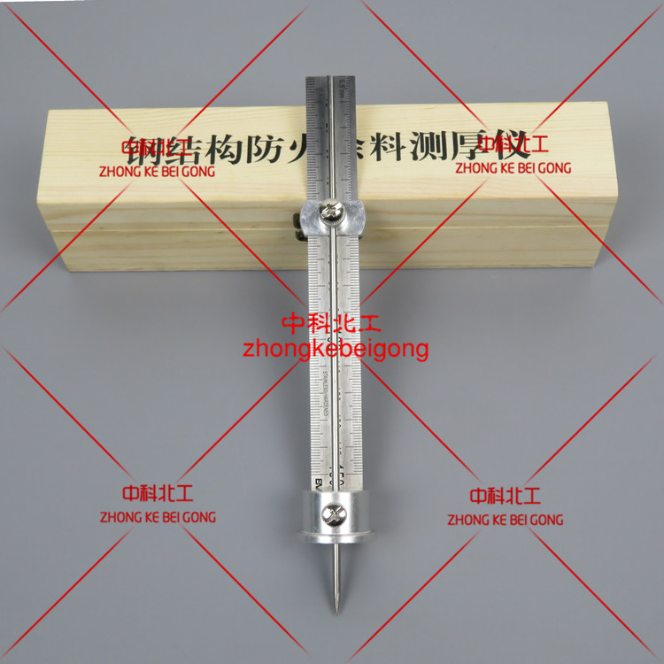 鋼結(jié)構(gòu)防火涂層測厚儀由針桿和可滑動的圓盤組成,圓盤始終保持與針桿垂直,并在其上裝有固定裝置,圓盤直徑不大于30mm,以保證完全接觸被測試件的表面,如果測厚測量儀不易插入被插材料中,也可使用其他適宜的方法測試。測試時,將測厚探針垂直插入防火涂層直至鋼基材表面上,記錄標(biāo)尺讀數(shù)。