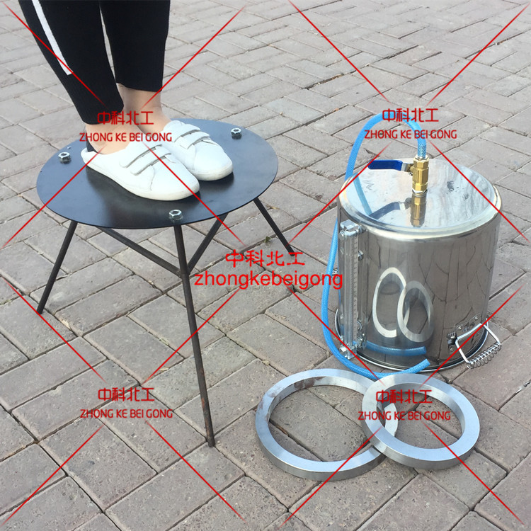 6.4.3.3 在整平后的地表,將座板固定。將聚乙烯塑料膜沿環(huán)套內(nèi)壁及地表緊貼鋪好。記錄儲(chǔ)水筒初始水位高度,擰開(kāi)儲(chǔ)水筒的注水開(kāi)關(guān),從環(huán)套上方將水緩緩注入,至剛滿(mǎn)不外溢為止。記錄儲(chǔ)水筒水位高度,計(jì)算座板部分的體積。在保持座板原固定狀態(tài)下,將薄膜盛裝的水排至對(duì)該試驗(yàn)不產(chǎn)生影響的場(chǎng)所,然后將薄膜揭離底板。