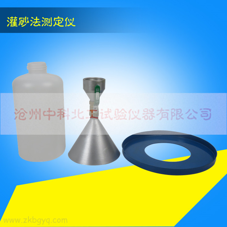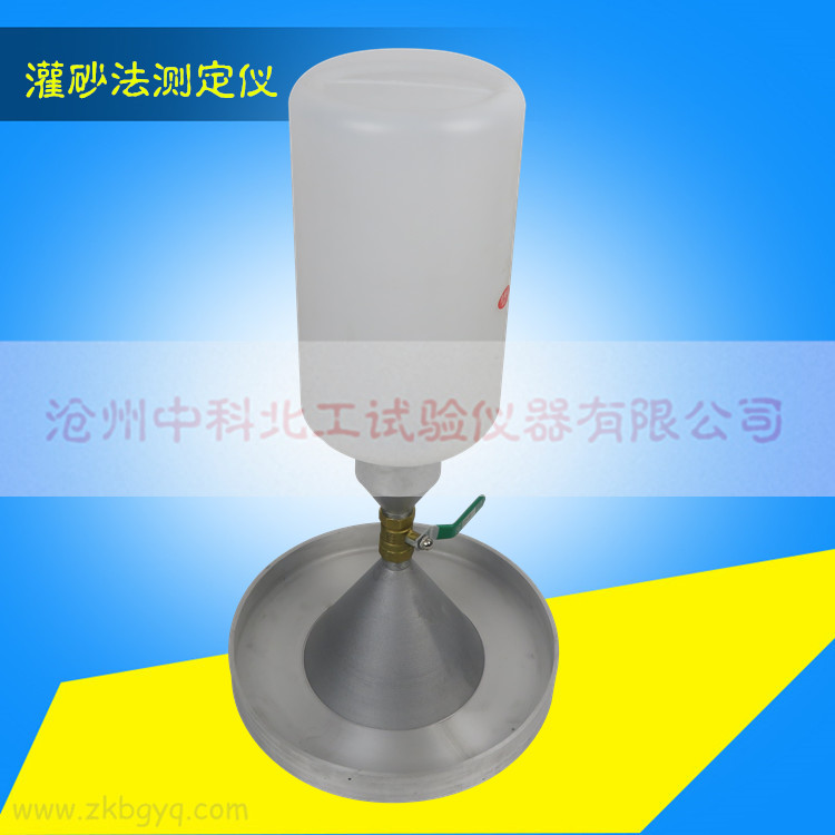 1、密度測量器:有容砂瓶,灌沙漏斗和底盤組成,灌砂漏斗高135mm,直徑165mm,容砂瓶容積為4L,容砂瓶與灌砂漏斗直徑用螺紋連接,灌砂漏斗尾部有圓柱形閥門,孔徑為13mm,底盤承托灌砂漏斗和容砂瓶。
