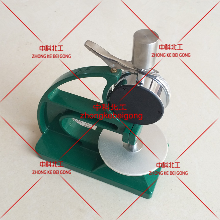 5、平穩(wěn)地抬起測厚儀測量壓板,將一塊已備好的被測小樣放在測量壓板與支座之間,輕輕地放下測量壓板使其與試樣接觸。待測厚儀指針穩(wěn)定后記錄百分表此時的讀數(shù),然后計算此小樣的實際厚度。