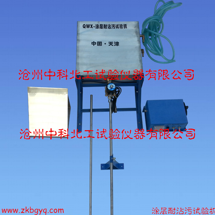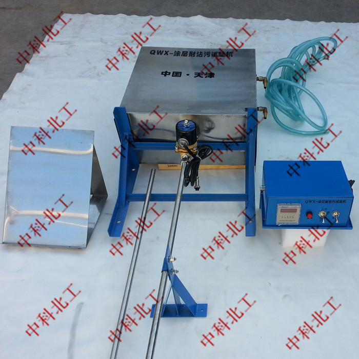 該試驗(yàn)機(jī)是涂層耐沾污試驗(yàn)的沖洗裝置。與反射率儀配合使用測定涂層耐沾污性。主要由不銹鋼水箱、流水管、樣板架及電磁閥、時(shí)間繼電器、等自動(dòng)控制裝置、水箱支架、控制器支架、管路支架等組成。