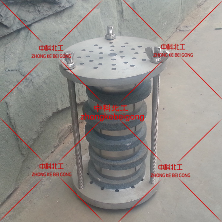 將試樣放入環(huán)刀內(nèi)填滿。上下兩面刮平。并貼上濾紙,放在兩塊透水石中間,將五個(gè)(根據(jù)需要可少于五個(gè))試樣疊放,用蝶型螺母將透水石、環(huán)刀夾緊。