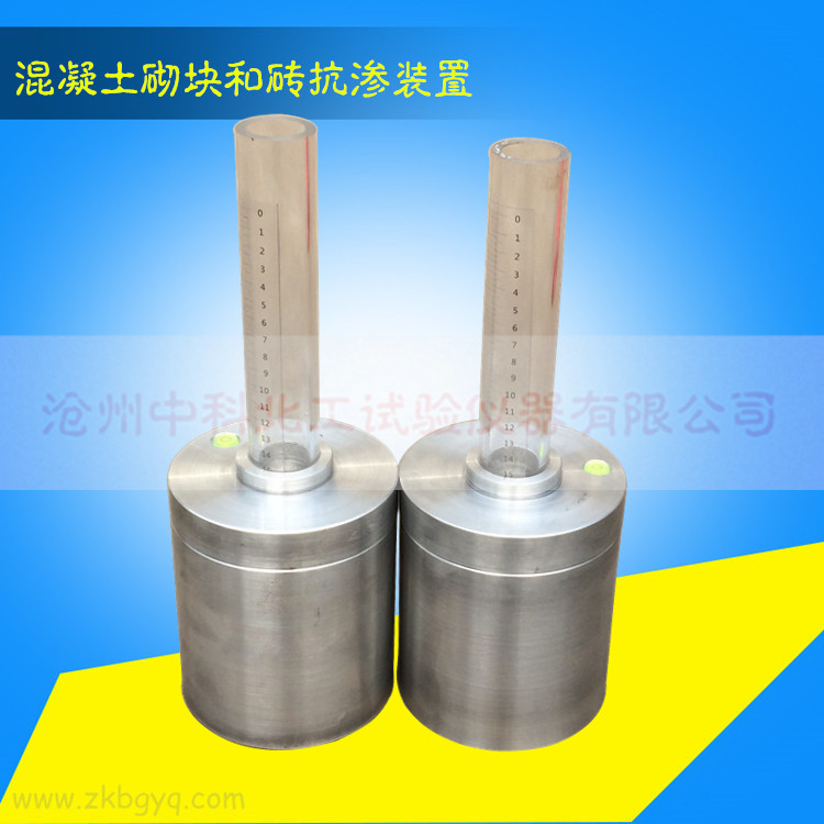 依據(jù)《GBT 4111-2013 砼小型砌塊試驗(yàn)方法》《JCT 641-2008 裝飾混凝土砌塊》國家建材行業(yè)標(biāo)準(zhǔn)生產(chǎn),適用于裝飾混凝土砌塊做抗?jié)B性能試驗(yàn),試件直徑為100mm園柱體。試驗(yàn)裝置測量精度高,設(shè)計(jì)精巧耐用,該方法操作簡單,勞動(dòng)強(qiáng)度小,能直接表述試件的抗?jié)B性能。
