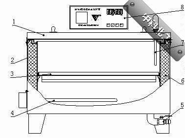 1、箱蓋,2、外箱,3、擱架,4、加熱管,5、放水閥,6、保溫層,7、溫度傳感器,8、控制器。